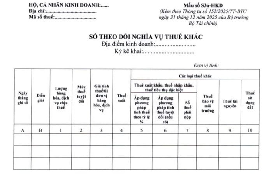 Trường hợp phát sinh các loại thuế khác: Mở thêm sổ theo dõi nghĩa vụ thuế